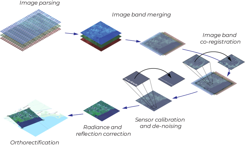 Unibap LOOM is all about changing this. At its core, LOOM is a data pre-processing pipeline that takes raw data and converts it into a much more refined data product. And it does it fast. On our iX10, it’s possible to transform raw multispectral data into orthorectified satellite images in real time! Here’s how we do it:
